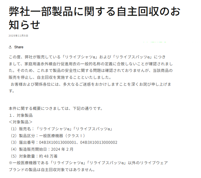 「リライブシャツα」「リライブスパッツα」は遠赤外線効果を持つプリント部分が限定的であったため、この基準を満たさないことが判明。同社は「定義への理解が不足していた」として販売停止と自主回収を決定しました。